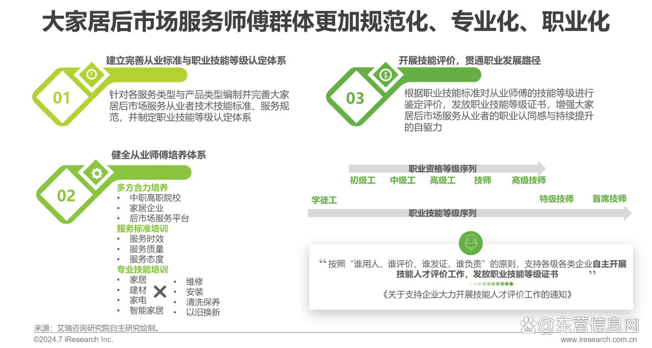 头部平台应联合大家居企业,针对各服务类型与产品类型编制并完善大家居后市场服务从业者技术技能标准、服务规范,为从业师傅提供明确的能力要求指引,并制定职业技能等级认定体系,综合运用理论知识考试、技能操作考核、业绩评审、竞赛选拔、企校合作等多种鉴定考评方式,畅通的成长通道将大大激发师傅提升自身的专业技能水平和服务能力的积极性,提高师傅群体的专业化、职业化程度,为消费者提供更安心省心优质的后市场服务。