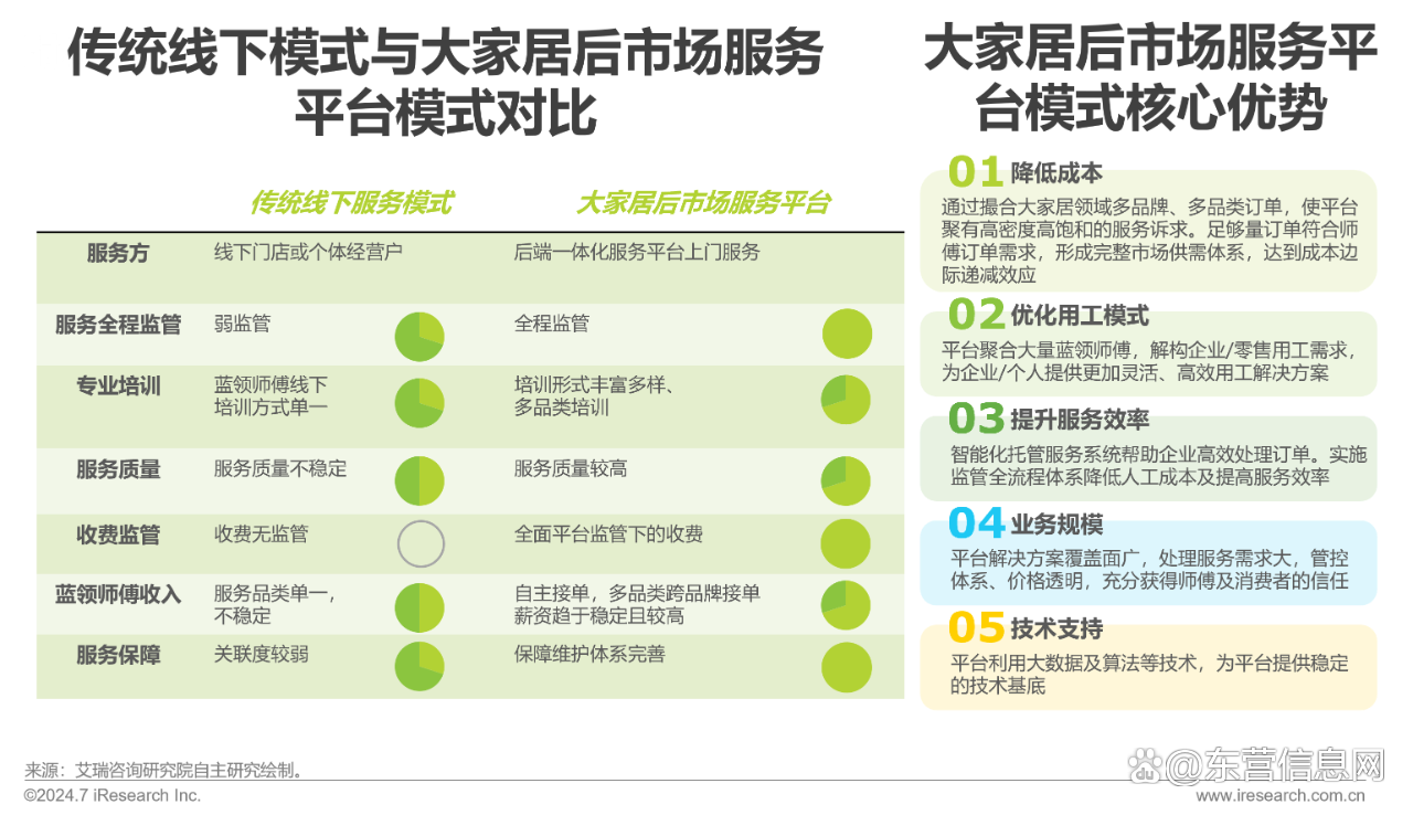 大家居后市场服务行业内有不同的业务模式的参与者,其中核心模式包括传统的线下服务模式及新型的后市场服务平台模式。在传统的线下模式中,消费者直接与服务方打交道,通过线下门店、熟人推荐等方式找到工程师或服务公司,不涉及任何外部平台。随着互联网平台的渗透率增强与基础技术设施的发展,出现了一体化的大家居后市场服务模式。与传统模式相比,大家居后市场服务模式建立了统一的服务标准和透明的价格准则,不断优化服务质量,从而提高服务效率和用户体验,进一步提升消费者和企业的满意度。