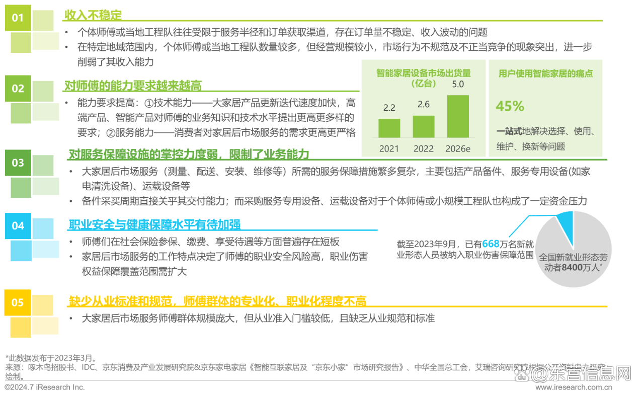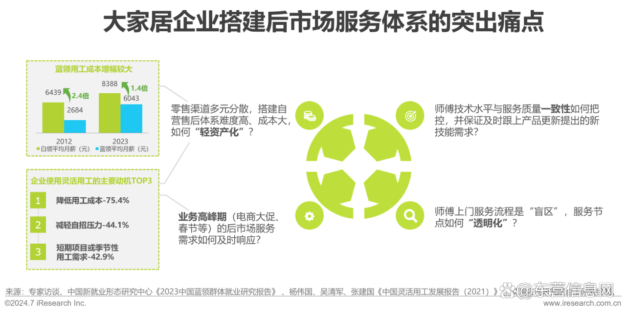 大家居企业搭建后市场服务体系的痛点主要体现在1.成本高:蓝领群体的平均月薪由 2012 年的 2684 元增长至 2023 年的 6043 元,剔除通胀因素后,蓝领人群实际平均月薪是10年前的1.85倍,这驱动大家居企业使用灵活用工来降低成本,同时更灵活高效满足其业务高峰期的后市场服务需求;2.服务质量稳定性与服务流程把控存在难点:广义上的灵活用工既包括劳务派遣、非全日制用工、外包、承揽等传统方式,也包括数字经济驱动下的平台用工模式。灵活用工意味着重结果交付、轻用工管理,如何在实现后市场服务体系“轻资产化”的同时,保证服务流程可控与服务质量稳定性是大家居企业面临的新挑战。
