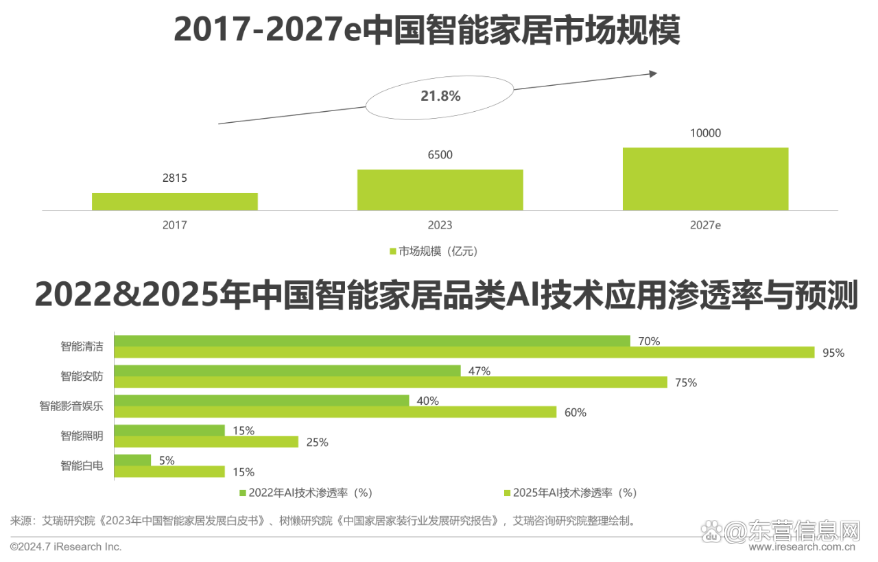 近年来,得益于人民可支配收入的提高和对舒适品质家庭生活的不断追求,以绿色智能化为特点的大家居产品成为产业发展的主要趋势,为用户带来个性化定制化体验,更好地满足了用户对智能生活的需求,也越来越成为拉动大家居行业增长的重要引擎。大家居行业正从渠道时代转向服务时代。中国智能家居市场规模预计2027年有望突破万亿,其中,AI技术迭代加速了大家居产品智能化渗透,进一步服务用户日常生活,大家居消费潜能有望进一步激发。