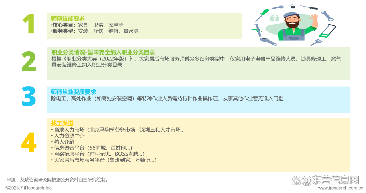 大家居后市场服务市场规模的持续增长推动用工规模扩张,艾瑞估算,2023年大家居后市场服务用工规模达到911万人。根据核心家居产品类目和服务类型,大家居后市场服务师傅包含众多细分类型,但除家用电子电器产品维修、锁具修理、燃气具安装维修外,其余工种暂未纳入职业分类目录,相应的国家职业技能标准也存在缺位;从师傅的找工渠道来看,线下渠道包括区域劳务市场、人力资源中介、熟人介绍等;线上渠道则包括信息聚合平台、网络招聘平台、大家居后市场服务平台。