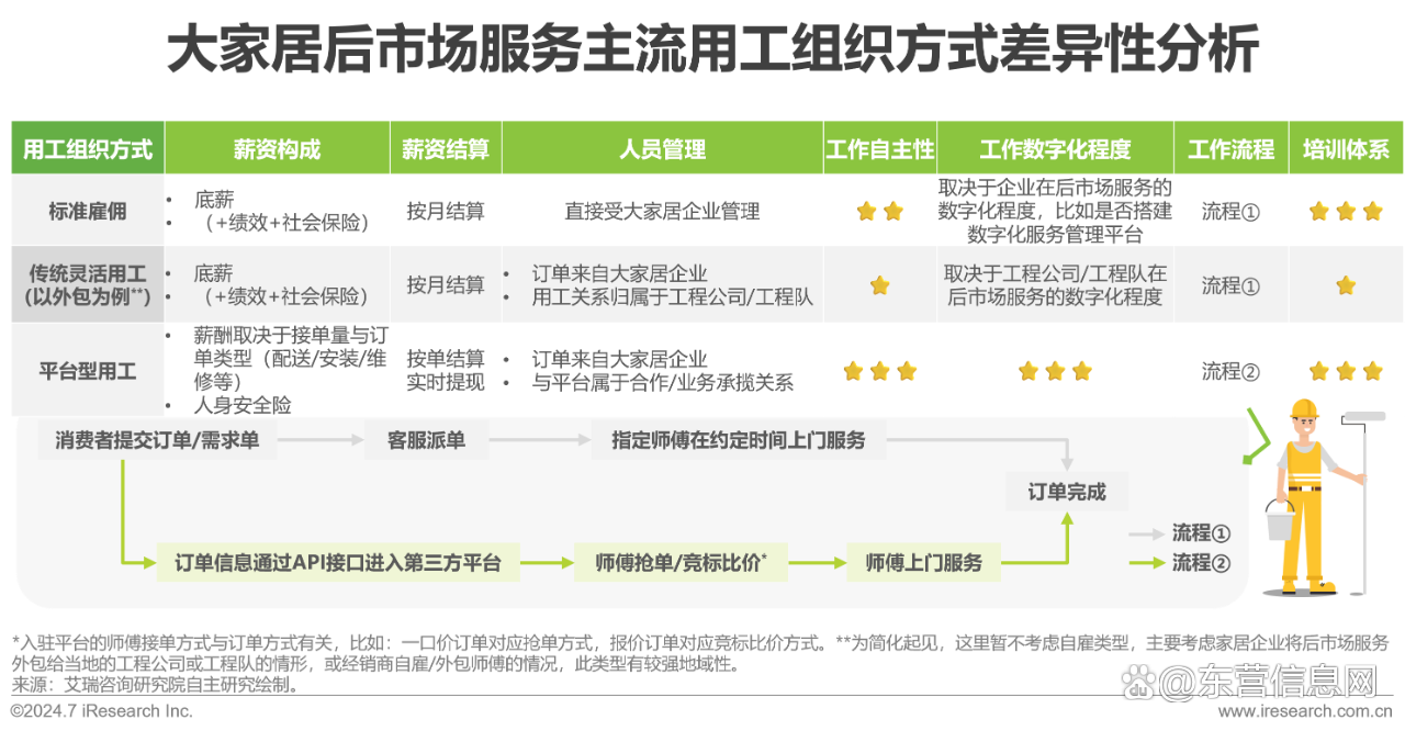 大家居后市场服务采取的用工方式主要有三种:1.标准雇佣,即师傅直接受雇于大家居企业;2.传统灵活用工,典型情形是大家居企业将后市场服务以外包或劳务派遣形式交由当地的工程公司或劳务派遣单位,师傅的日常管理和薪资发放由工程公司/劳务派遣单位负责;3.平台型用工,符合资质要求的师傅入驻平台后即可接单,与平台构成合作/业务承揽关系,对平台的从属性较弱,拥有更高的工作自主性,且师傅收入与接单量、服务类型直接挂钩,因平台订单覆盖范围更广,师傅可承接的订单量也相对更多。