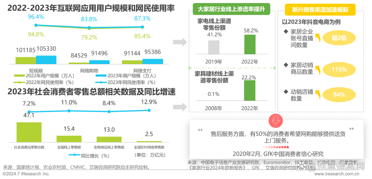 伴随着移动互联网的快速普及,大家居行业的线上渗透率显著增长。2022年家电和家具建材线上渠道零售份额售额分别为58.2%和22.2%。同时大家居厂商线上销售渠道日益多元化,天猫、京东不断向线下市场渗透,融合了社交、内容与电商多重属性的抖音、小红书等新型销售渠道正在加速崛起,越来越多大家居企业借助此类渠道实现“用户认知-种草-购买-分享”的消费转化。值得一提的是,2023年全国农村网络零售额达2.5万亿元,同比增长12.9%,农村信息基础设施建设不断完善和物流体系覆盖面逐步扩大为下沉市场消费潜能的释放提供了前提和基础。更加多元的全域零售渠道体系、更广泛的市场覆盖面对大家居售后服务提出了更多挑战。