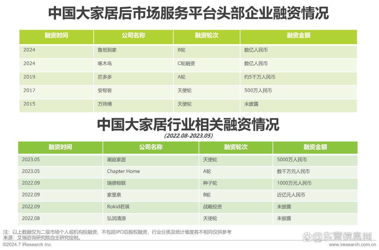 自2021年以来,家居家装行业非上市公司的投融资动作就出现了下降,对比早年高峰时期,成长型企业的融资环境变得不容乐观。尽管融资和上市情况并不理想,但是产业从其他层面释放变革信号,大家居后市场服务平台及智能家居得到资本更多的青睐。2024年,大家居后市场服务行业共发生二起资本融资事件,头部企业在加速进攻和扩张,融资资金用于产品技术升级、运力体系升级和品牌营销等,这类平台的发展推动了大家居产业链的升级和优化,对于提升整个行业的竞争力和发展水平具有重要意义,我们预计未来大家居行业后市场服务平台仍然是投资热点。
