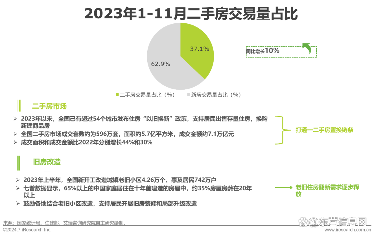 房地产市场交易结构由新房逐步转向存量房,地产正步入存量时代。政策端持续发力,以更好满足购房者刚性和改善性住房需求——“租购并举”、“房住不炒”、房贷利率下调等宽松政策落地,强调加快推进老旧小区改造和老年家庭适老化改造。加速促进家居存量翻新需求释放,大家居行业消费属性持续增强。而2023年1-11月,全国二手房交易量占住房总交易量的比重达37.1%,较上年同期提高约10个百分点。二手房装修、老旧住房翻新等改善性需求正成为大家居消费的关键推动力。