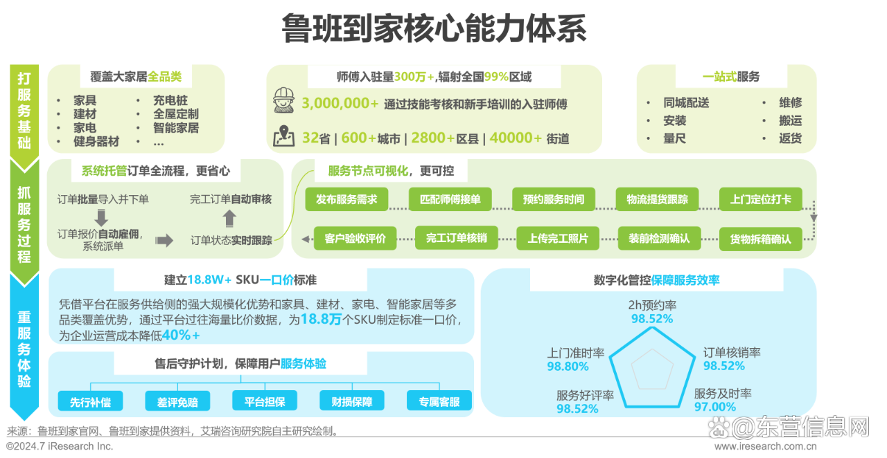 鲁班到家聚合并链接起供给端的300万+蓝领技工与需求端的大家居企业,保证了其服务在家居品类、服务类型、地域上的广泛覆盖;同时公司打造的数字化交付系统不仅实现了企业用户从下单到订单完工验收全流程的自动化,也满足了企业基于服务节点进行智能化透明管控的需求;平台为18.8万个SKU制定一口价标准,为企业运营成本降低40%,基于大数据管控算法搭建的立体化服务管控体系持续优化服务流程节点,2h预约率、订单核销率、上门准时率等关键能力指标均在97%以上,同时平台先行建立的标准化平台保障机制,包括先行补偿、差评免单、平台担保、财损保障、专属客服等,为企业用户及终端消费者的服务体验保驾护航。