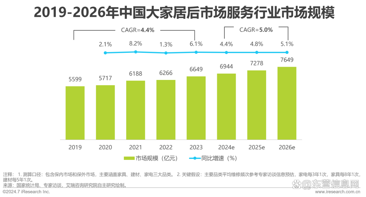 2023年中国大家居后市场服务行业市场规模达6649亿元,同比增长6.1%,伴随房地产市场的边际改善带动大家居产品销售,大家居行业产品创新及以旧换新政策推动消费者更新换代,预计2024-2026年均复合增长率为5.0%,2026年市场规模将达7649亿元。
