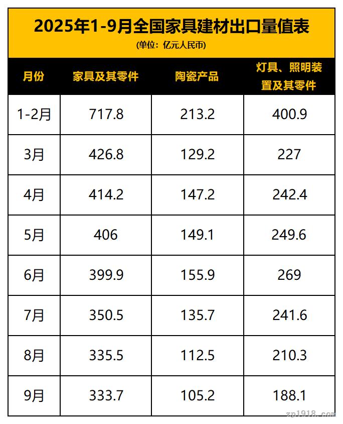从单月数据看,9月份家具出口333.7亿元,灯具照明类产品出口188.1亿元,陶瓷产品出口105.2亿元。