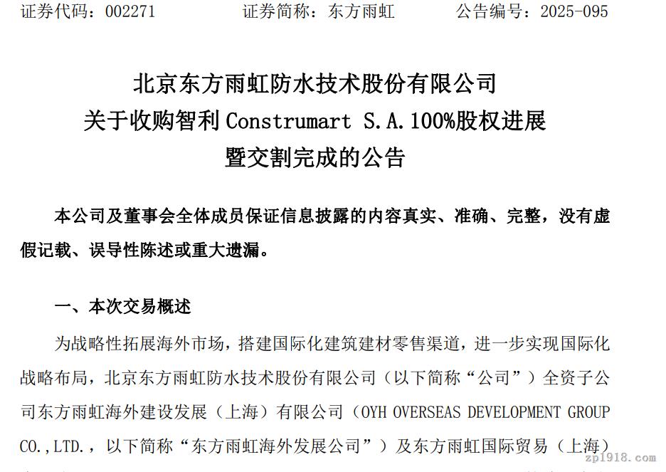 10月14日,东方雨虹(13.550, 0.05, 0.37%)(002271.SZ)发布公告,宣布其收购智利建筑零售企业Construmart S.A.100%股权的交易已正式完成交割。