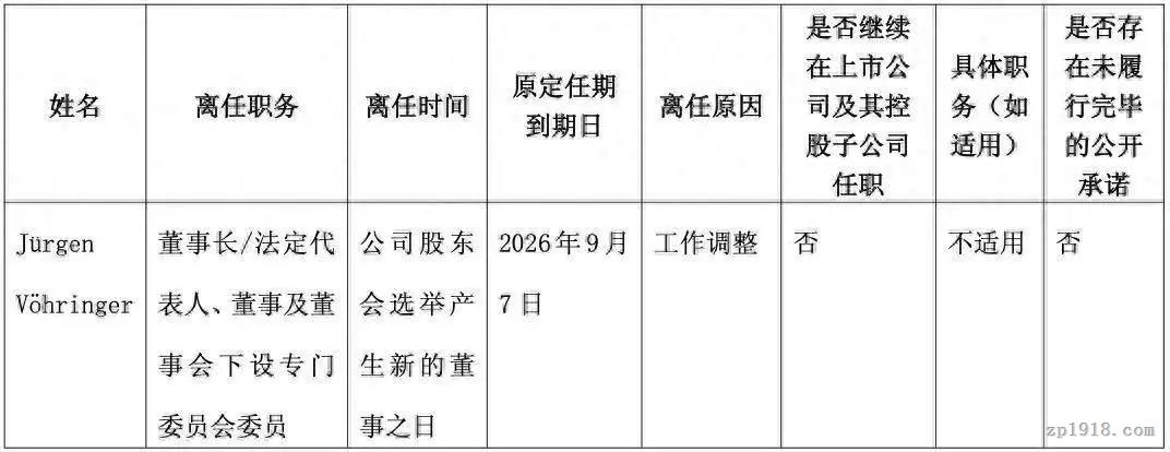 因工作调整,Jürgen Vöhringer申请辞去公司董事长/法定代表人、董事及董事会下设专门委员会委员职务,辞职后将不在公司担任任何职务。