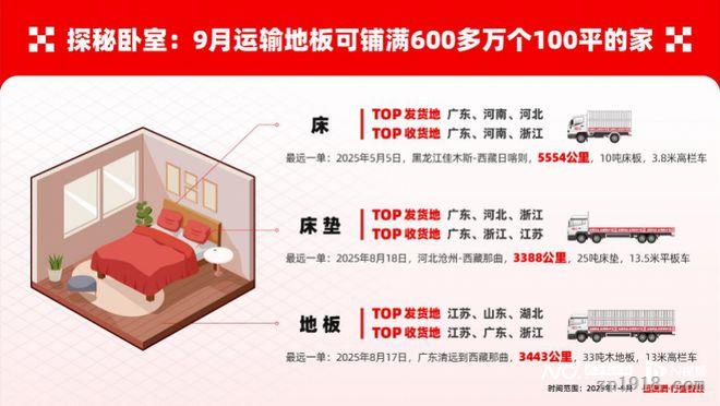 运满满行业数观显示,仅9月一个月,通过运满满平台运输的地板面积就可铺满600多万个100平方米的家,这一数据充分展现了中国家居市场的庞大规模。今年以来最远的一单地板,在8月17日这天,由广东清远发往了西藏那曲,长途跋涉走过了3000多里路。