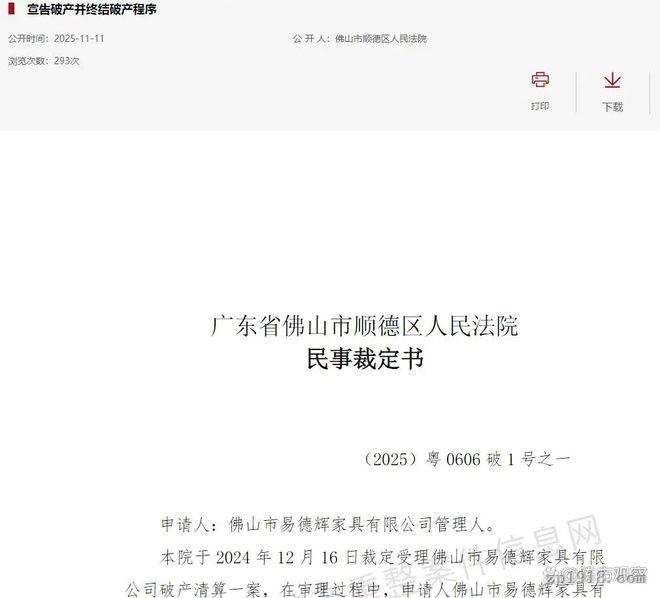 据破产文件显示,以佛山市易德辉家具有限公司(以下简称“易德辉家具”)资产无法覆盖其全部债务为由,佛山市顺德区人民法院于11月10日依法裁定宣告其破产,并在全国企业破产重整案件信息网进行公示。至此,经营仅有4年的家具企业彻底倒下。