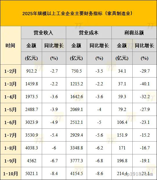 这些数据与整体工业环境形成对比。1-10月份,全国规模以上工业企业实现利润总额59502.9亿元,同比增长1.9%,自8月以来累计增速已连续三个月保持增长。在整体工业营业收入同比增长1.8%的背景下,家具制造业及其相关产业的持续承压,凸显出特定行业面临的结构性挑战。