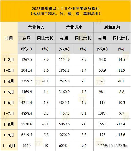 木材加工和木、竹、藤、棕、草制品业方面,其利润降幅从1-3月的-11.9%收窄至1-7月的-9.7%,但此后降幅持续扩大,到1-10月已骤降至-27.3%,尤其是10月单月的表现极差,这表明行业面临的困境在下半年非但没有缓解,反而急剧加深。