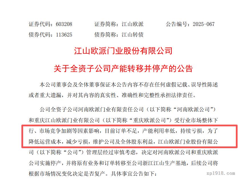 此次招租行动紧随公司近期的产能调整。根据江山欧派10月发布的公告,由于订单不足、产能利用率低导致持续亏损,公司已决定对河南欧派门业有限责任公司与重庆江山欧派门业有限公司实施停产,所有业务与订单悉数转移至浙江江山生产基地。