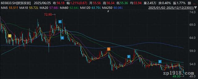 12月12日,欧派家居收于50.53元/股,较年内72.90元/股的高点跌超30%;盘中最低至49.30元/股,创年内新低。