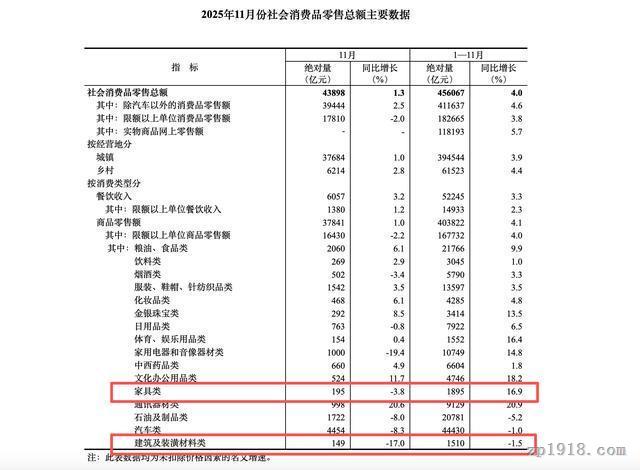此外,建筑及装潢材料类商品11月零售总额为149亿元,同比下降17%;1-11月累计零售总额达1510亿元,同比下降1.5%。
