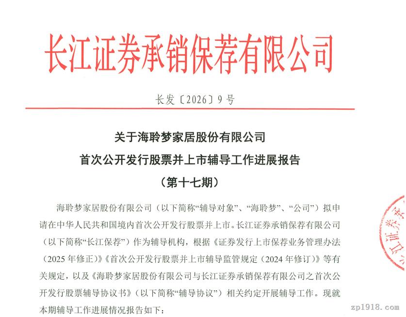 近日,海聆梦家居股份有限公司(以下简称:海聆梦家居)披露首次公开发行股票并上市辅导工作进展报告(第十七期),辅导机构为长江证券承销保荐有限公司。