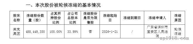 近日,公司收到控股股东美克集团的通知,广东省深圳市宝安区人民法院对美克集团所持公司4.88亿股股份进行了轮候冻结,占公司总股本的33.99%,占美克集团持有公司股份的100.00%。