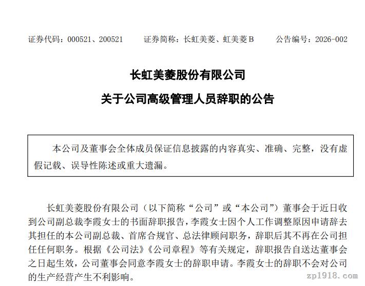 1月21日,长虹美菱(000521.SZ)发布公告,李霞因个人工作调整原因申请辞去其担任的公司副总裁、首席合规官、总法律顾问职务,辞职后其不再在公司担任任何职务。