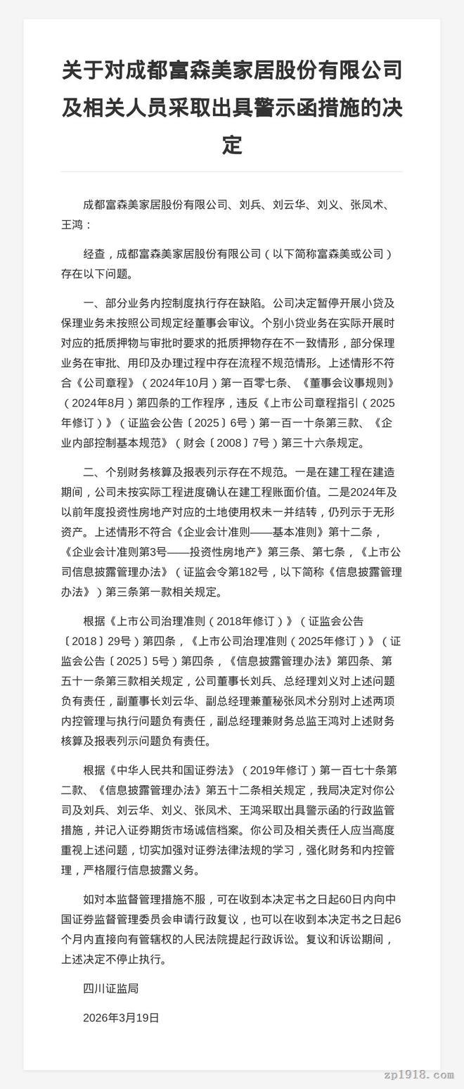 近日,四川证监局发布行政监管措施决定书,剑指成都富森美家居股份有限公司、刘兵、刘云华、刘义、张凤术、王鸿。