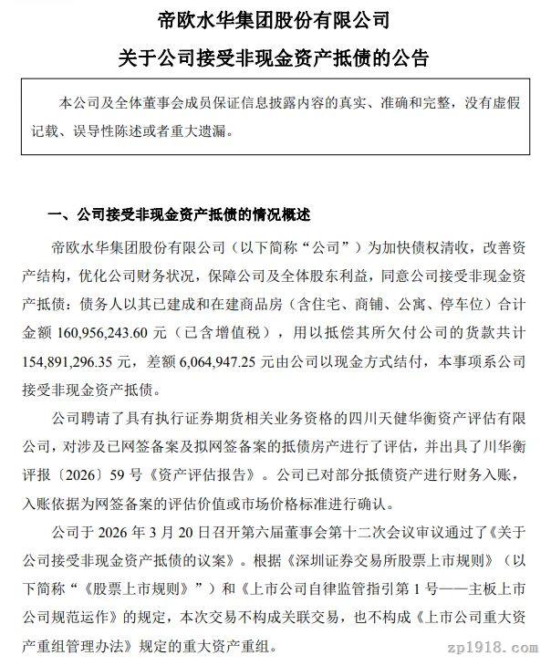 3月20日,帝欧家居(帝欧水华,002798)公告,接受万科、碧桂园、龙湖、融创等19家房企“以房抵债”,涉及270套房产、车位,作价1.61亿元,抵偿1.55亿元货款,公司还倒贴606万元差价。资产覆盖成都、武汉、广州、昆明等十余城,含住宅、商铺、公寓。