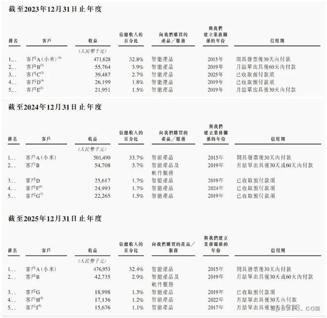 小米更是Aqara绿米的第一大客户,连续三年贡献了超三成的收入。招股书显示,2023-2025年,Aqara绿米来自小米的营收分别为4.716亿元、5.015亿元、4.770亿元,对应营收占比32.8%、33.7%、32.4%。三年来,这个比例几乎没有变化,且其他客户的规模与小米差距悬殊,有依赖单一客户的风险。