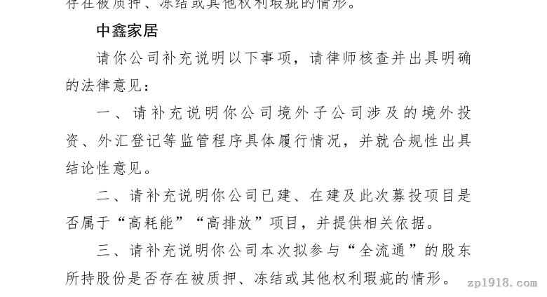 中鑫家居被要求补充说明公司境外子公司涉及的境外投资、外汇登记等监管程序具体履行情况,并就合规性出具结论性意见。说明公司已建、在建及此次募投项目是否属于“高耗能”“高排放”项目,并提供相关依据。公司本次拟参与“全流通”的股东所持股份是否存在被质押、冻结或其他权利瑕疵的情形。