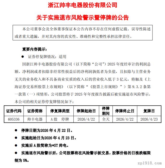 公司股票将于4月22日停牌1天,自4月23日开市起复牌并实施退市风险警示,证券简称由“帅丰电器”变更为“*ST帅电”,日涨跌幅限制为5%。若公司2026年度财务指标继续触及相关情形,股票将被终止上市。公司董事会表示将积极优化产品结构、控制成本费用并推进投资并购,力争早日撤销退市风险警示。