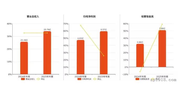 公司营业总收入为33.79亿元。归母净利润为8.57亿元。经营活动现金净流入为7.89亿元。