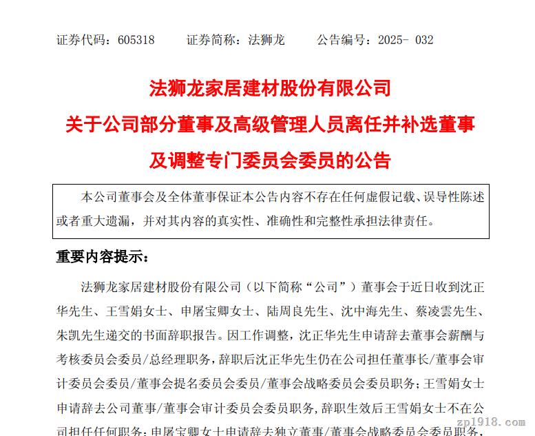 9月29日,法狮龙(605318.SH)发布公告,披露公司董事会及管理层多名成员职务变动。此次调整涉及7名高管,包括董事、独立董事及董事会秘书等关键职位,同时公布新提名董事及独立董事候选人。