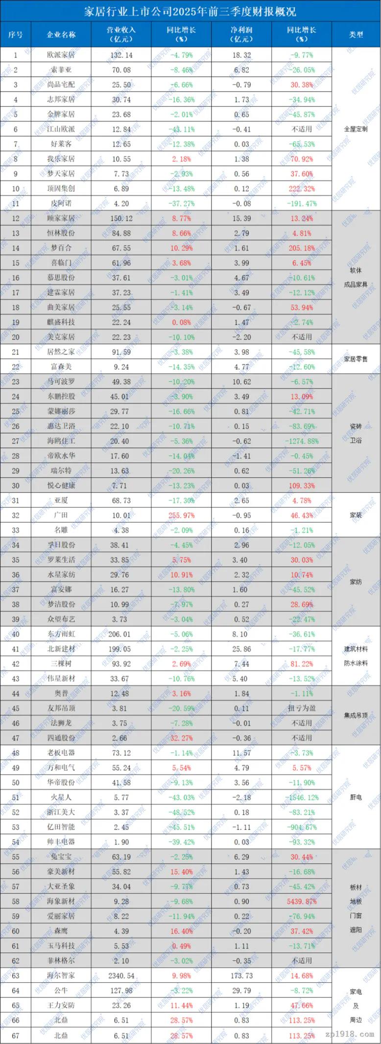 截至2025年10月30日18时,已有67家家居上市企业陆续披露2025年三季度报告。