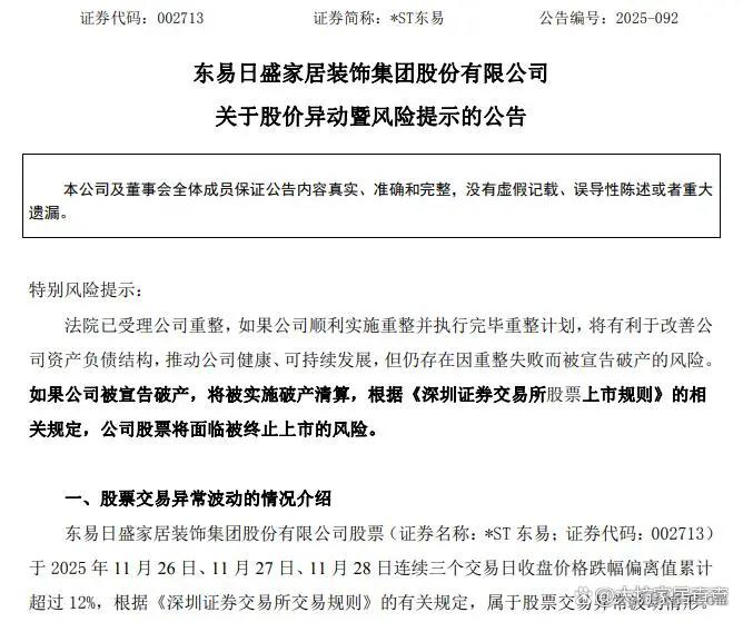 近日,曾被称为"家装第一股"的东易日盛家居装饰集团(*ST东易)发布公告,直言公司面临因重整失败而宣告破产的风险。这家由陈辉创立于1996年的家装领军企业,如今资产负债率已飙升至172.40%,净资产为负,连续三年扣非净利润亏损,股票被多次实施风险警示。一个曾经的行业标杆,为何陷入如此困境?