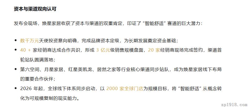 在商业合作方面,焕星家居宣布数千万元天使投资意向明确。40余家经销商达成合作共识,形成3亿元销售规模,20家经销商已完成签约。