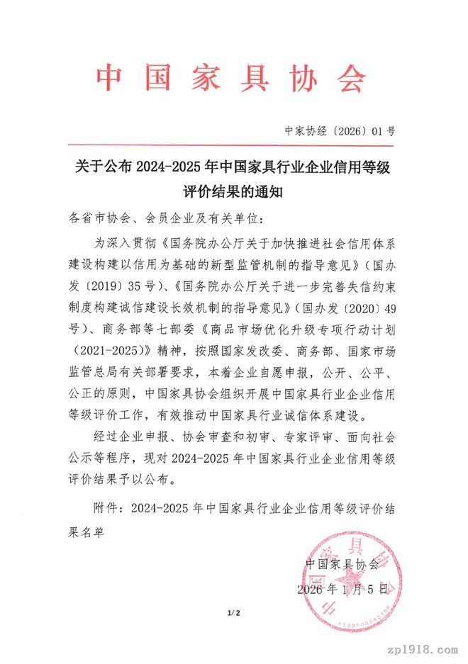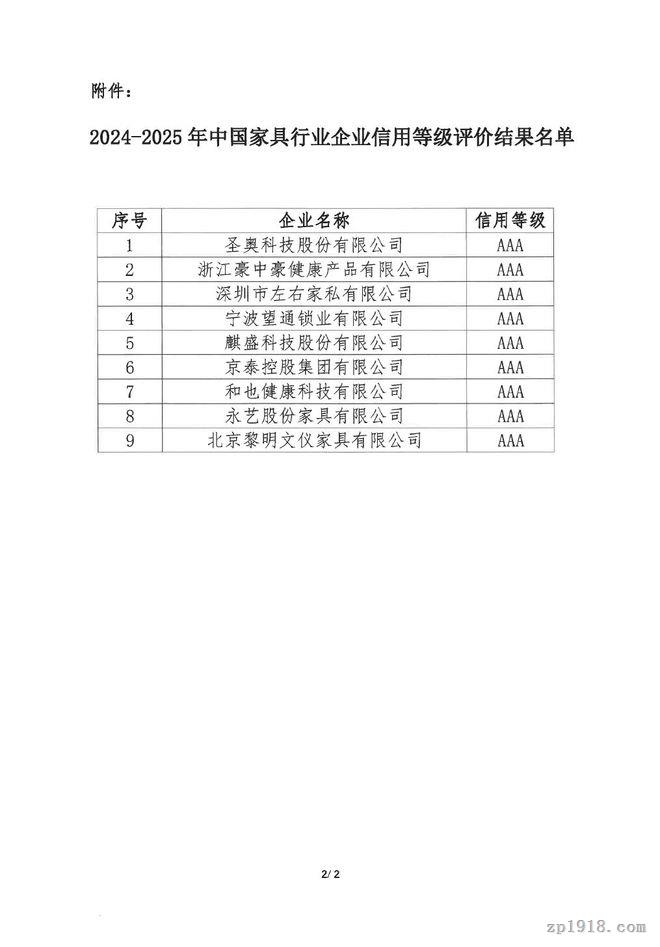 2026年1月5日,中国家具协会正式公布2024-2025年度中国家具行业企业信用等级评价结果。圣奥科技股份有限公司、浙江豪中豪健康产品有限公司、麒盛科技股份有限公司、和也健康科技有限公司、永艺股份家具有限公司等五家浙江家具企业荣获最高信用等级“AAA”评价。