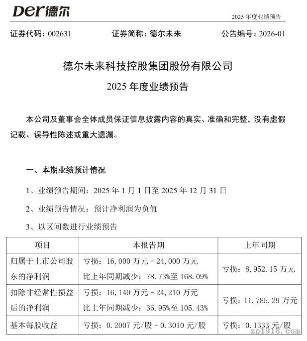 1月29日,德尔未来科技控股集团股份有限公司(以下简称“德尔未来”)发布2025年度业绩预告,公司预计2025年归属于上市公司股东的净利润为亏损1.6亿元至2.4亿元,相较于上年同期亏损8952.15万元,亏损幅度不仅未能收窄,反而可能大幅扩大78.73%至168.09%。