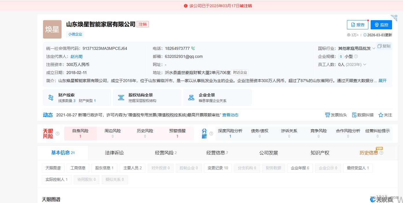 值得关注的是,发布会相关报道未披露主体公司。在天眼查以“焕星家居”为关键词进行检索,发现一家业务高度相似的企业——“山东焕星智能家居有限公司”。该公司注册于2018年,但最新记录显示其已于2025年3月完成注销。