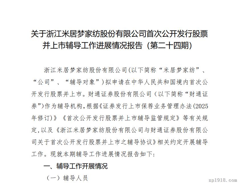 4月15日,浙江米居梦家纺股份有限公司(以下简称:米居梦家纺)披露首次公开发行股票并上市辅导工作进展情况报告(第二十四期),辅导机构为财通证券股份有限公司。