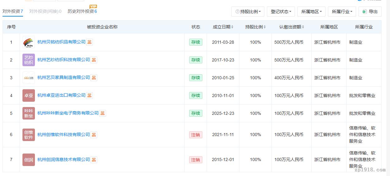 米居梦家纺对外投资有5家公司,包括杭州艺贝家具制造有限公司、杭州艺纱纺织科技有限公司等。